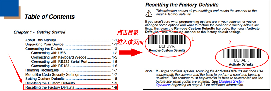 一般恢復出廠設置的介紹在第一章節(jié),如上圖,我們在目錄中就可以很明顯的找到【Resetting the Factory Defaults】,點擊進入該頁面,依次掃描這兩個條碼即可。